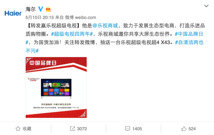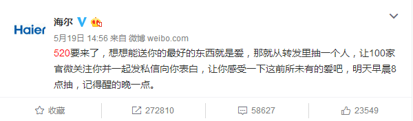 520表白日,海爾搞了一個(gè)事情,聯(lián)合60多家藍(lán)V,給一位幸運(yùn)粉絲送禮物。這條轉(zhuǎn)發(fā)評論送禮物的微博在半個(gè)小時(shí)之內(nèi)就轉(zhuǎn)發(fā)過萬。