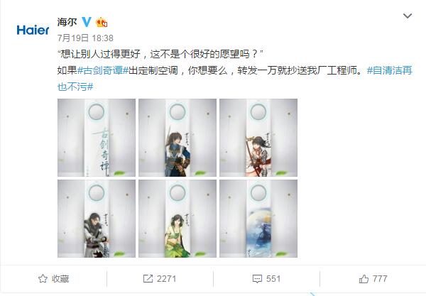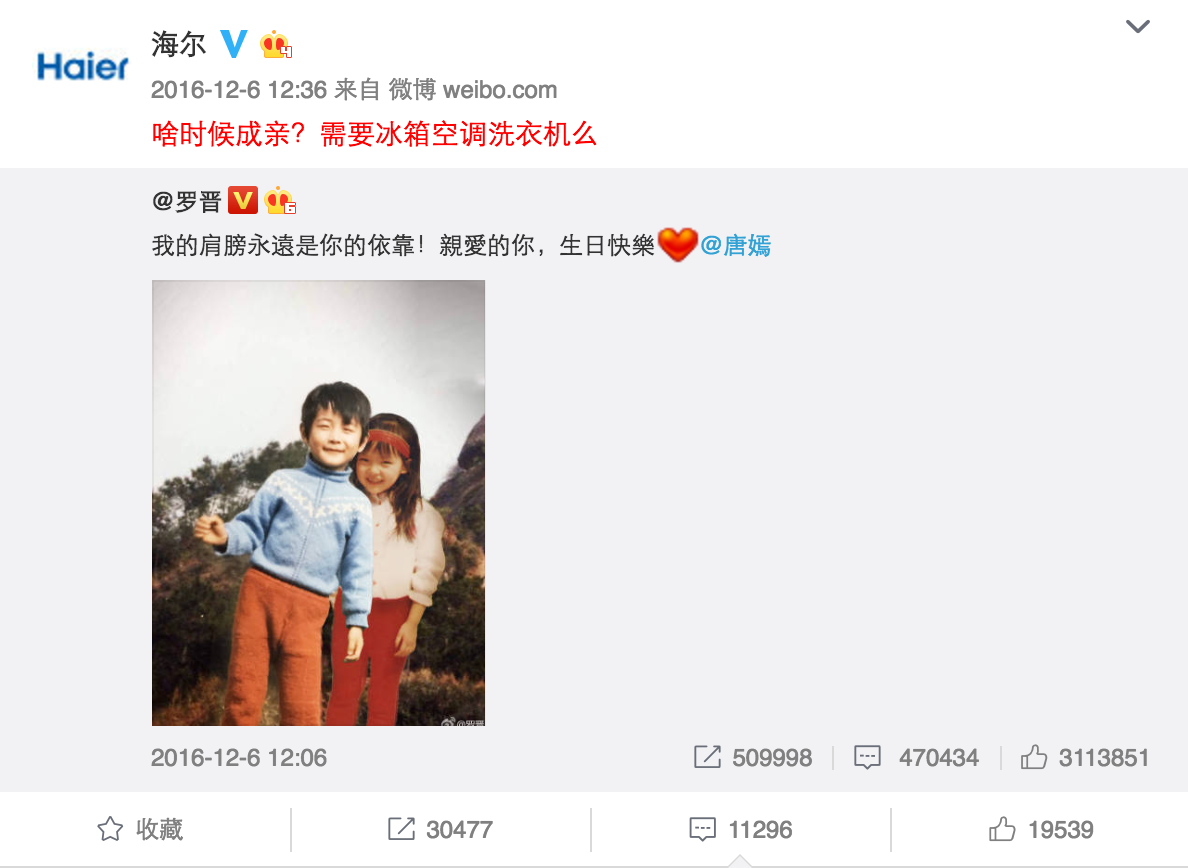 說到海爾,大家的第一印象大多都是搶熱門。比如唐嫣羅晉公布戀情時(shí),海爾官微借勢發(fā)布微博"啥時(shí)候成親?需要冰箱空調(diào)洗衣機(jī)么"成功帶領(lǐng)了一眾藍(lán)V搞事情,因?yàn)檫@個(gè)句式很容易被模仿,所以藍(lán)V的參與度非常高。