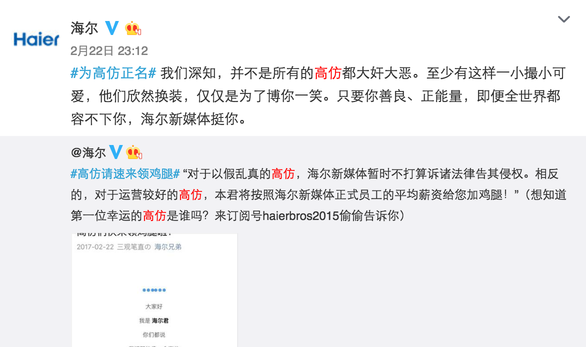 不知道從什么時(shí)候開始,平時(shí)刷微博時(shí)你會發(fā)現(xiàn)很多的高仿號,潛伏于各大評論中真假難辨。@海爾作為藍(lán)V總教頭,也遇見過很多海爾的高仿號,后來發(fā)現(xiàn),其實(shí)這些高仿號是海爾的年輕用戶,他們想搶熱門,跟你的粉絲有效互動(dòng)。面對這么一批可愛的小粉絲,@海爾沒有封殺,而是做官方聲明,只要你善良,且正能量,哪怕全世界都不管你我們呼喚你,甚至還給高仿號發(fā)福利。