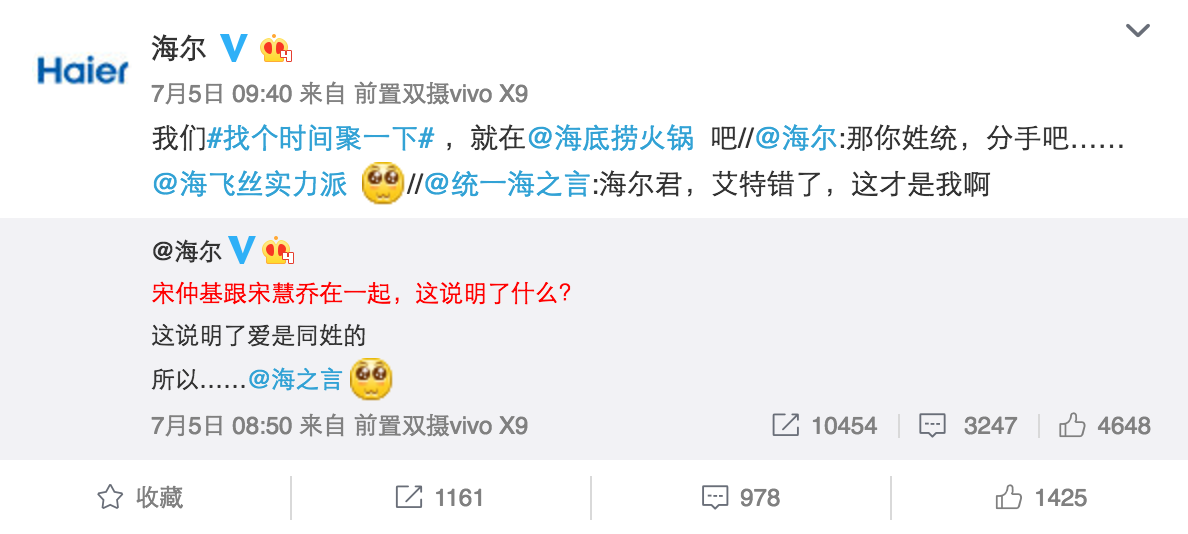 海爾搶熱門的能力在前幾天宋仲基宋慧喬公布戀情時(shí),再次得到了印證。海爾迅速get到了宋仲基和宋慧喬同姓的點(diǎn),發(fā)微博@和自己同姓的品牌強(qiáng)行組CP,同姓組CP這個(gè)點(diǎn)也很容易被模仿,藍(lán)V參與度也異常高漲,比如"海信@海天醬油"、白貓凈界@白敬亭"等等。