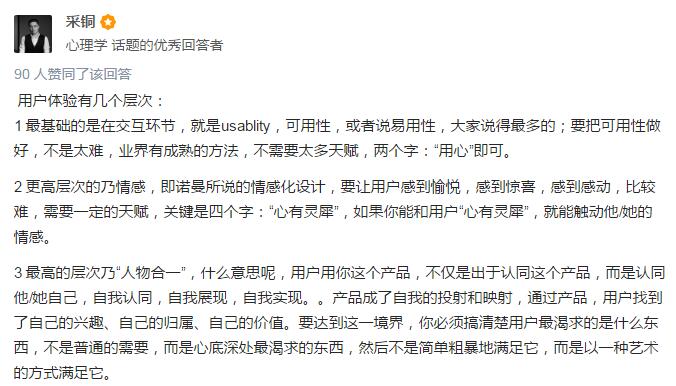 大神的這個解釋是不是很哲學?說了一大頓根本不知道在說什么。通俗的解釋是,產(chǎn)品用戶體驗做的好,就是我們用產(chǎn)品的時候感覺好,便利親切,一切以我們的角度來設(shè)計。